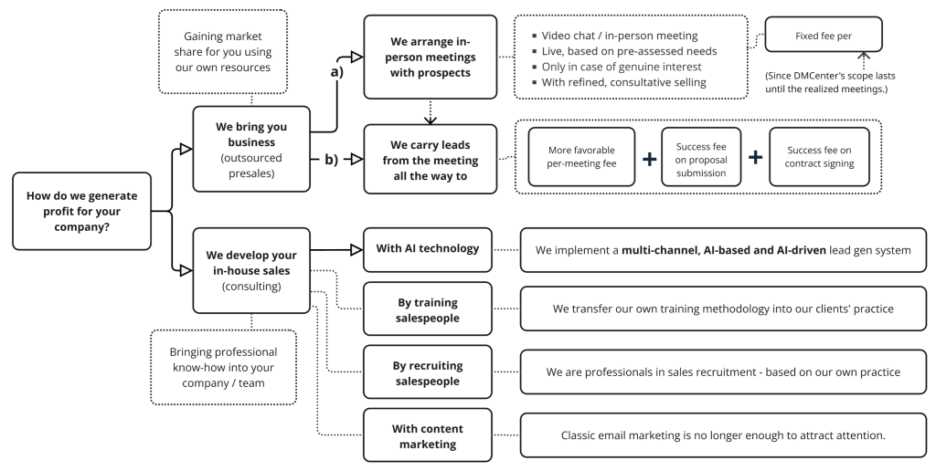 DMCenter offers the two strongest pillars of B2B sales system building: outsourced presales and in-house sales development. Both are designed to deliver new customers and real revenue for your business — faster, more predictably, and supported by AI technology.